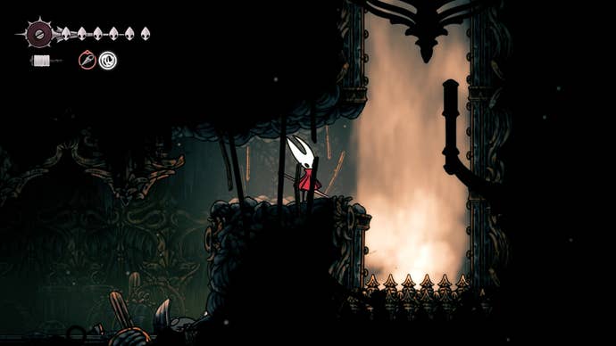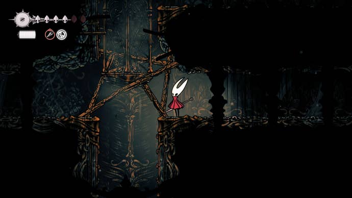 After collecting the Silkeater, climb back up and take the first left to find a wooden barricade. Attack it repeatedly to break it down and create an elevator shortcut back to the bench area.