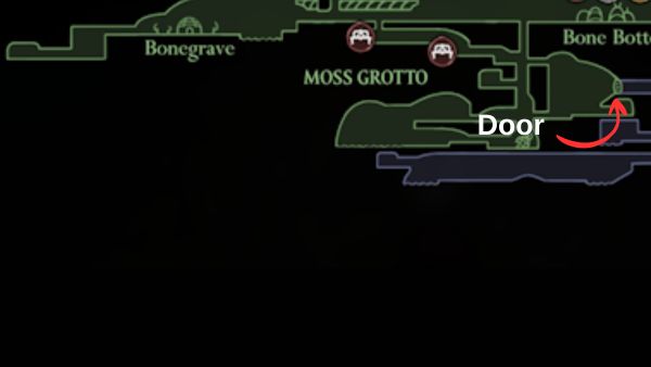From Bone Bottom, descend directly downward to locate this door in the lower sections of Moss Grotto. The eastern positioning makes it accessible from multiple entry points within the region.